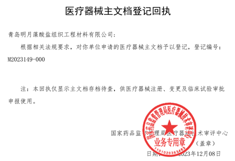 截至目前已有313家企業(yè)在器審中心進行了主文檔登記,我公司為首家藻酸鹽類醫(yī)療器械原料主文檔登記企業(yè)。主文檔登記公示后,使醫(yī)療器械生產企業(yè)能方便的獲悉我公司的生產能力,擴大了在醫(yī)療器械原料領域的影響力。