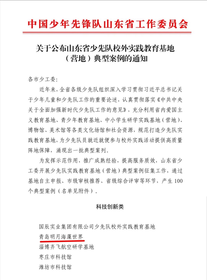 近日,山東省少工委印發《關于公布山東省少先隊校外實踐教育基地(營地)典型案例的通知》,青島明月海藻世界成功入選 “ 山東省少先隊校外實踐教育基地(營地)典型案例 ” 。