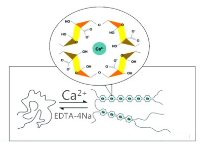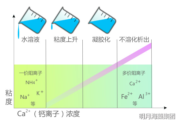 海藻酸鹽遇到鈣離子可迅速發生離子交換,生成凝膠,其凝膠具有熱不可逆性。高G型海藻酸鹽生成的凝膠硬度大但易碎;高M型海藻酸鹽生成的凝膠則相反,柔韌性好但硬度小。調整兩種比例可生產不同強度的凝膠。利用凝膠特性,可用于制作各種仿生食品、用材料、面膜、廢水處理劑、保鮮膜等。