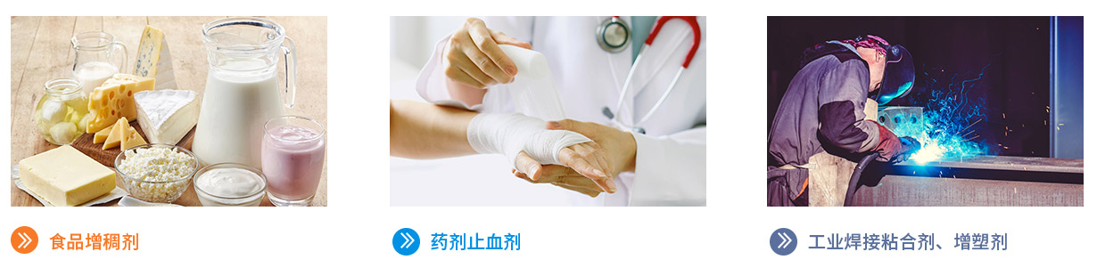 1、用于食品的粘結劑、增稠劑、保水劑,在食品中鹽分的影響下,鈣-鈉交換,形成增稠性的高鈣膠,多為配合海藻酸鈉使用。