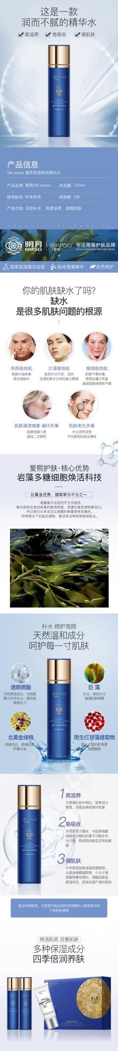 產品介紹:富含褐藻巨藻提取物,多重保濕成分,滋潤保濕,凈化肌膚,促進后續營養吸收。含金縷梅提取物等成分鎮定肌膚,質地清爽,親膚不黏膩。